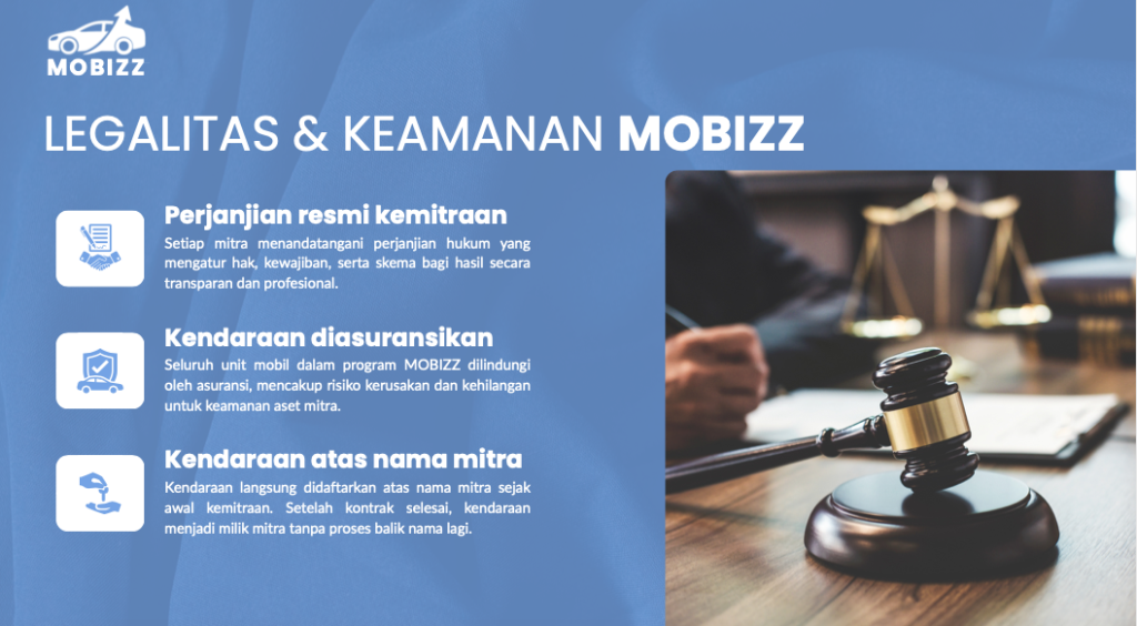 MOBIZZ hadir sebagai jalan kemitraan di bisnis rental mobil, memberi Anda kesempatan punya usaha tanpa ribet ngurus operasional sehari-hari. Dengan sistem yang terbukti dan manajemen profesional, kami bantu Anda langsung terjun ke dunia otomotif dengan lebih mudah.